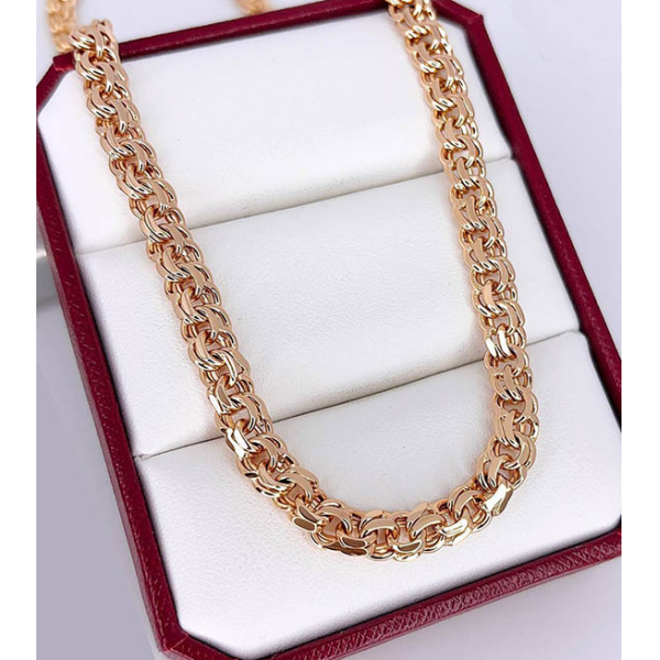 Не вызывающая аллергии бижутерия. Ювелирный сплав, покрытие — золото 585 пробы. Длина 60 см, ширина 6 мм.