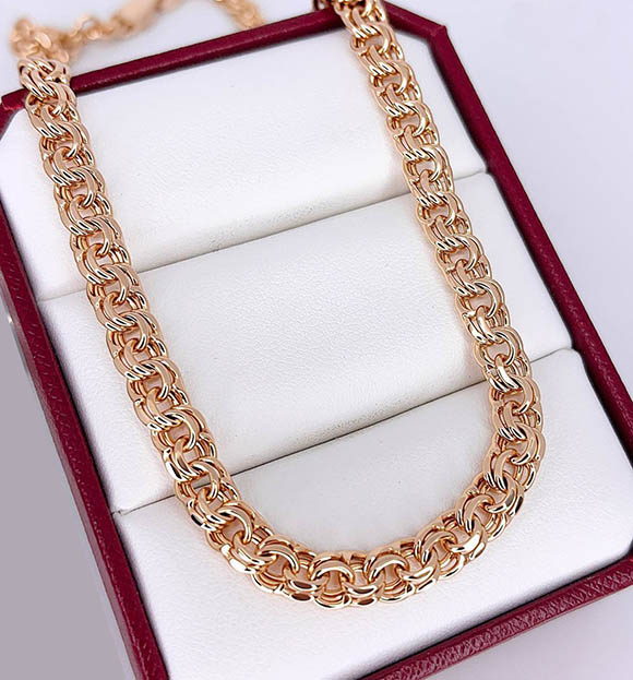 Гипоаллергенная бижутерия. Ювелирный сплав, покрытие — золото 585 пробы. Размер цепи 50 см, ширина 6 мм.