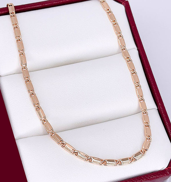 Не вызывающая аллергии бижутерия. Ювелирный сплав, покрытие — золото 585 пробы. Длина цепи 55 см, ширина 2 мм.