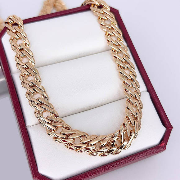 Гипоаллергенный сплав, покрытие из золота 585 пробы. Размер 45 см, ширина цепи 9 мм.