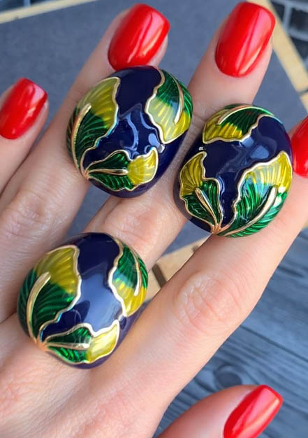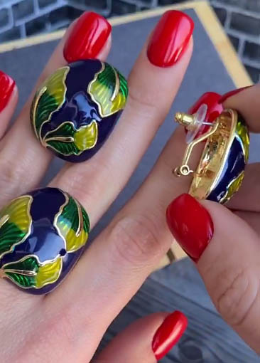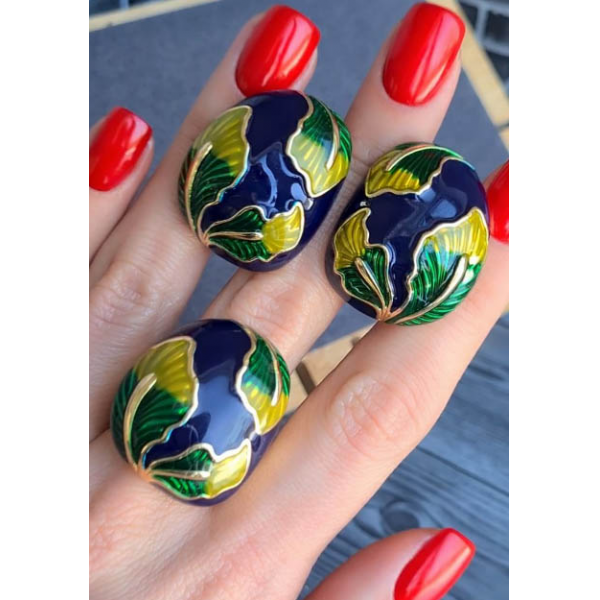 Гипоаллергенная бижутерия. Ювелирный сплав, покрытие — желтое золото, вставки выполнены из эмали. У серег итальянский замок. Размеры кольца: 18; 19.