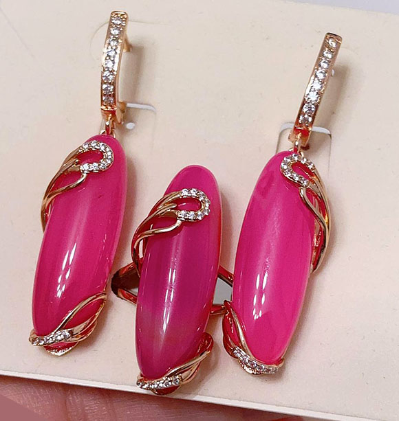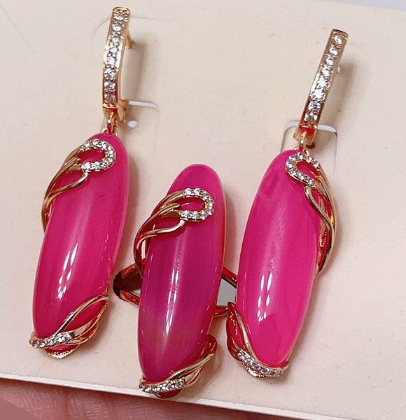Гипоаллергенная бижутерия. Ювелирный сплав, покрытие — золото 585 пробы, вставки — имитация натурального камня и фианиты. У серег английский замок. Размеры кольца: 20. Остался 1 набор.