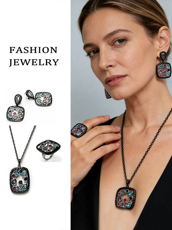 Гипоаллергенный бижутерный сплав, покрытие — черный родий, вставки — ювелирное стекло. У серег итальянский замок. Размер кольца: 17; 18; 19; 20. Серьги, кольцо или колье (кулон с цепочкой) можете приобрести отдельно.