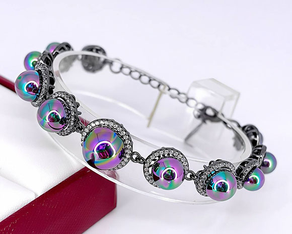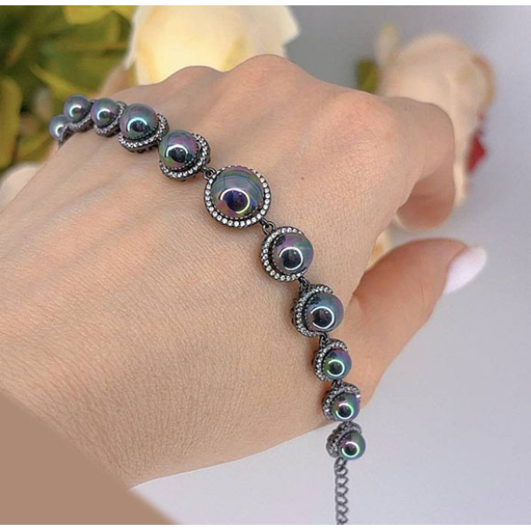 Не вызывающая аллергии бижутерия. Ювелирный сплав, покрытый черным родием, вставки — жемчуг майорка и фианиты. Размер 16 см плюс добор 3 см.