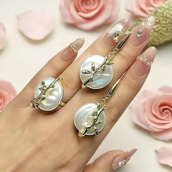 Гипоаллергенный бижутерный сплав, вставки — жемчуг майорка и фианиты. У серег английский замок. Размеры кольца: 17; 18; 19; 20. Серьги или кольцо из комплекта можно купить и отдельно. Вы также можете приобрести у нас колье (кулон с цепочкой) такого же дизайна.