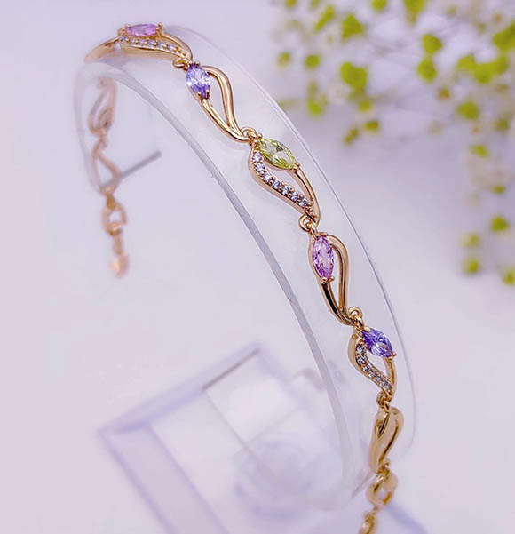 Гипоаллергенная бижутерия. Ювелирный сплав, покрытие выполнено из золота 585 пробы, фианитовые вставки. Размер браслета 17 см плюс добор 2 см.