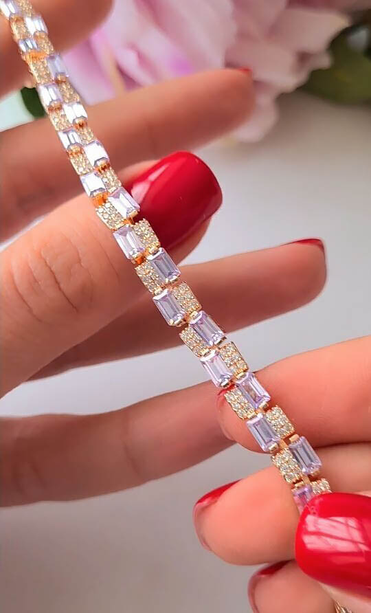 Позолоченный гипоаллергенный сплав (покрытие — золото 585 пробы), вставки выполнены из фианитов. Размер браслета: 18,5 см; 19 см; 20 см. Ширина 6 мм.