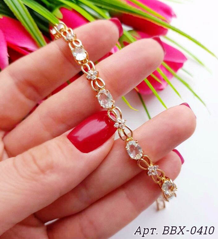 Позолоченный гипоаллергенный сплав, вставки — фианиты. Длина 18 см — 20 см, ширина 5,5 см.