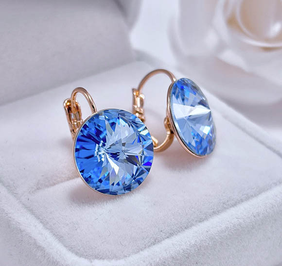 Ювелирный сплав, гипоаллергенное золотое покрытие (из золота 585 пробы), вставки — кристаллы Swarovski. У серег замок левербек. Длина серег 1,9 см, высота кристалла 1.4 см, замок левербек.