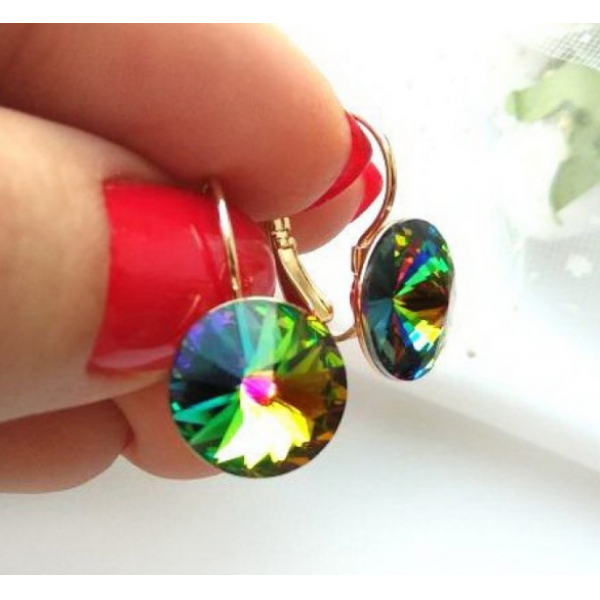 Не вызывающая аллергии бижутерия. Ювелирный сплав, покрытие из золота 585 пробы, вставки из кристаллов Сваровски. Размер серег 2 см, размер кристалла 1,2 см.