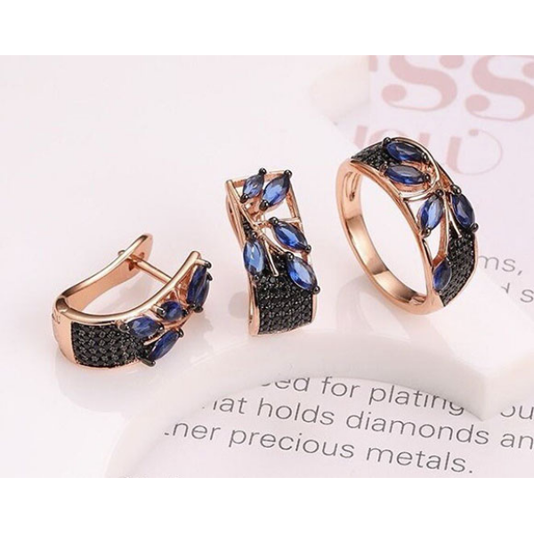 Не вызывающая аллергии бижутерия. Ювелирный сплав, покрытие — золото 585 пробы и черный родий, вставки — фианиты. У серег английский замок. Размеры кольца: 17; 18; 19; 20.