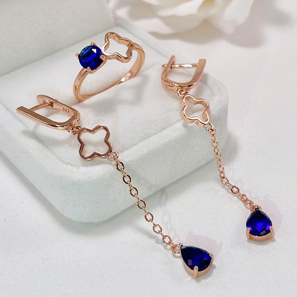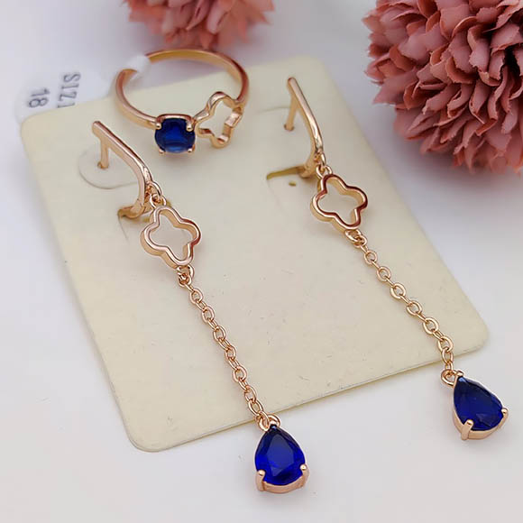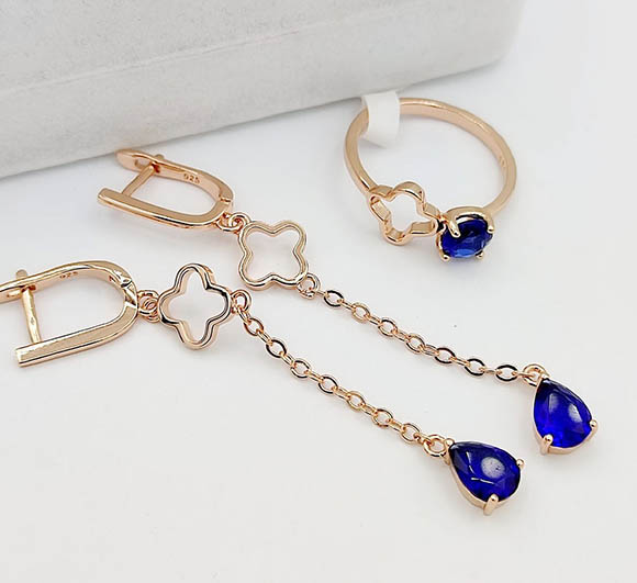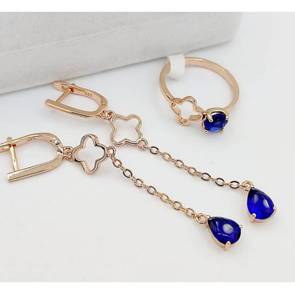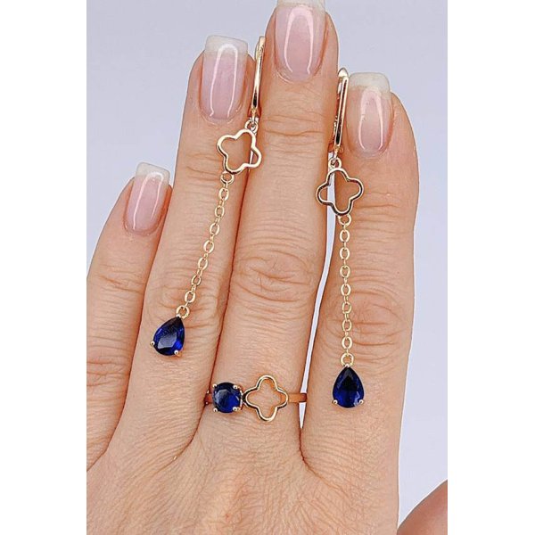 Ювелирный сплав, гипоаллергенное золотое покрытие (из золота 585 пробы), фианитовые вставки. Длина серег 6,4 см, английский замок. Размеры кольца: 18. Остался 1 набор.