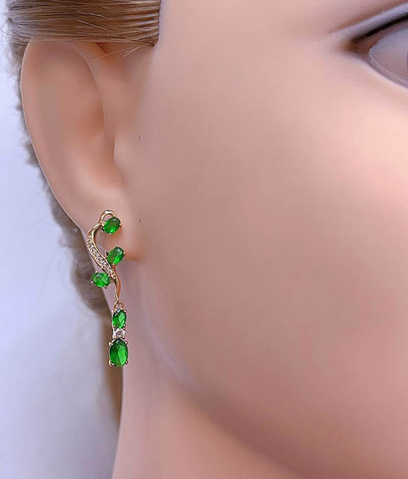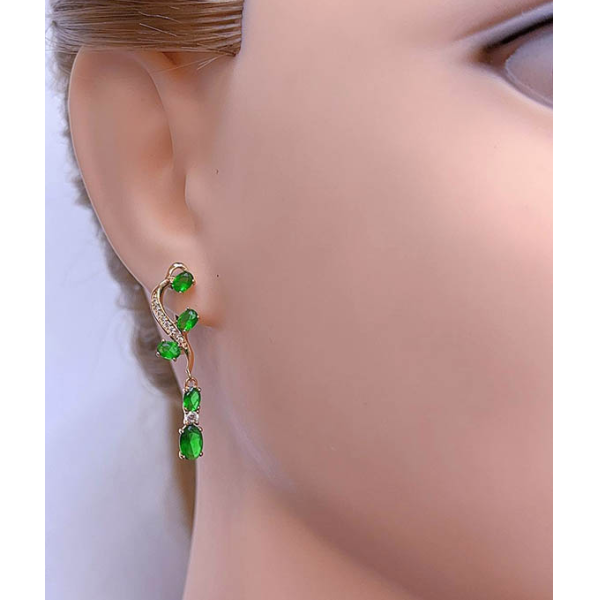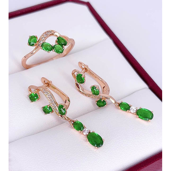 Не вызывающая аллергии бижутерия. Ювелирный сплав, покрытый золотом 585 пробы, вставки выполнены из фианитов. Длина серег 3,4 см, английский замок. Размеры кольца: 18,5. Остался 1 комплект.