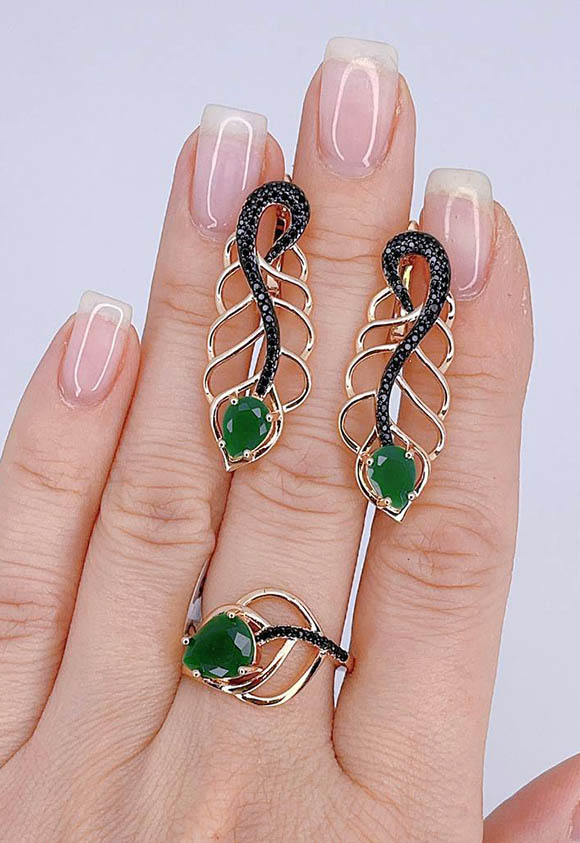 Ювелирный сплав, гипоаллергенное покрытие из золота 585 пробы и черного родия, вставки — фианиты. Размер серег 3,7 см, английский замок. Размер кольца: 18. Остался 1 набор.