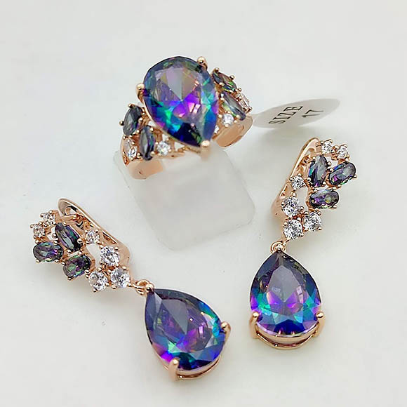 Гипоаллергенная бижутерия. Покрытый золотом 585 пробы ювелирный сплав, вставки — фианиты. Длина серег 3,7 см, английский замок. Размеры кольца: 17; 18; 19; 20.