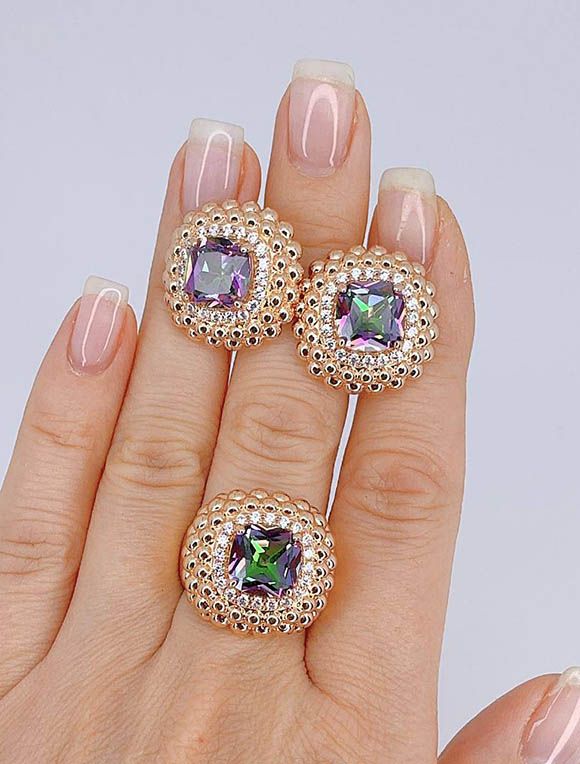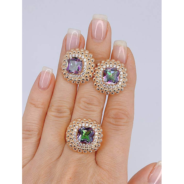 Гипоаллергенная бижутерия. Покрытый золотом 585 пробы ювелирный сплав, вставки — фианиты. У серег английский замок. Размеры кольца: 17; 18; 19; 20.