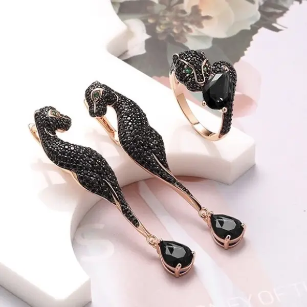 Не вызывающая аллергии бижутерия. Ювелирный сплав, покрытый золотом 585 пробы и черным родием, вставки — фианиты. Высота серег 5,3 см, английский замок. Размеры кольца: 17; 18; 19; 20.