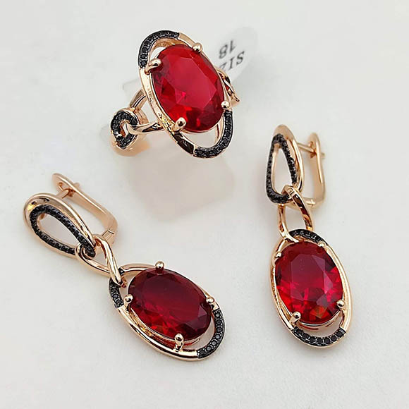 Не вызывающая аллергии бижутерия. Ювелирный сплав, покрытие — золото 585 пробы и черный родий, фианитовые вставки. Длина серег 4 см, английский замок. Размеры кольца: 17; 18; 19; 20.