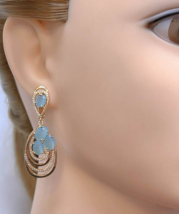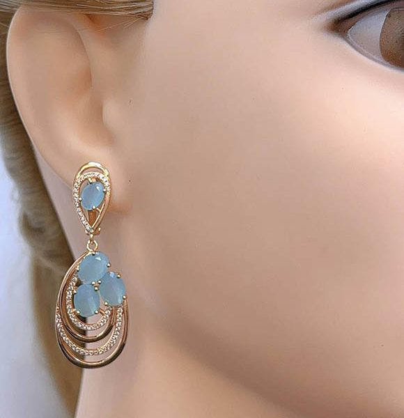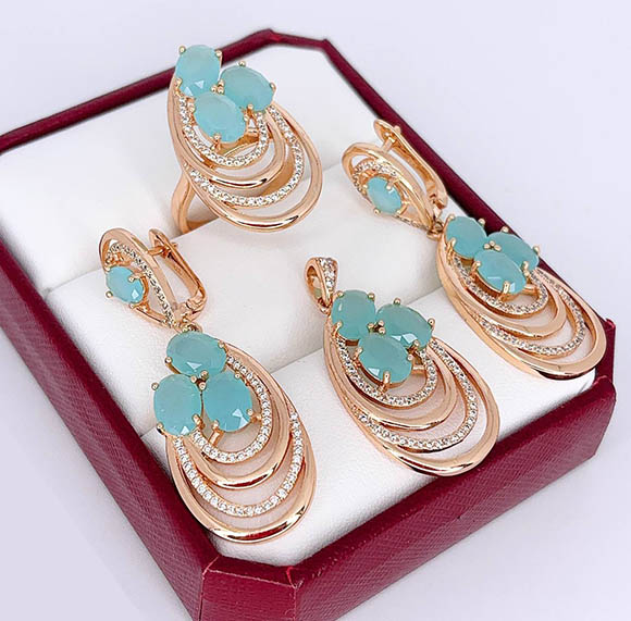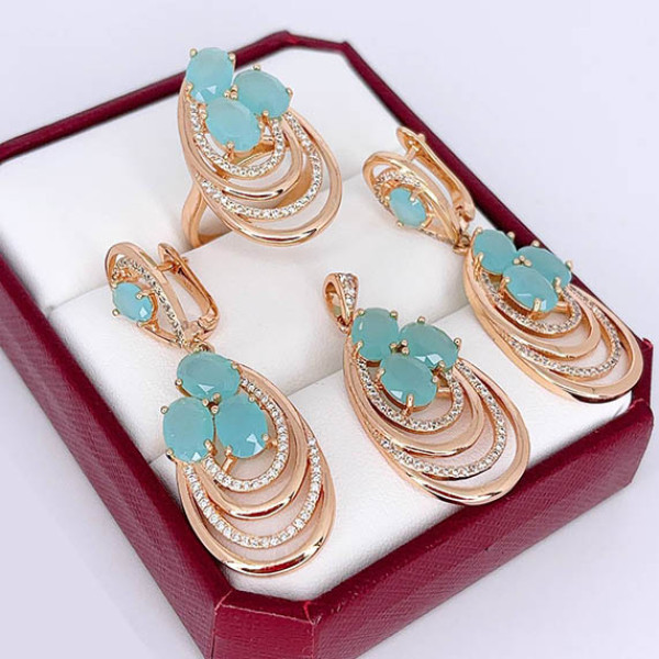 Гипоаллергенная бижутерия. Ювелирный сплав, покрытие — золото 585 пробы, фианитовые вставки. Длина серег 5 см, английский замок. Высота кулона 3,8 см, размер петельки 4 мм. Размеры кольца: 19. Остался 1 набор.
