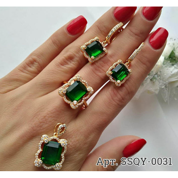Гипоаллергенная бижутерия. Покрытый золотом 585 пробы ювелирный сплав, вставки из фианитов. Размер серьги 3,2 см, длина кулона 2,2 см, размеры кольца: 18, 19.