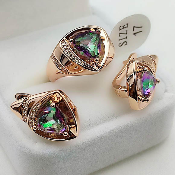Не вызывающая аллергии бижутерия. Ювелирный сплав, покрытый золотом 585 пробы, фианитовые вставки. Высота серег 2 см, английский замок. Размеры кольца: 17; 18; 19; 20.