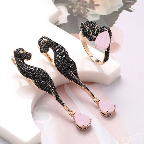 Гипоаллергенная бижутерия. Ювелирный сплав, покрытие выполнено из золота 585 пробы и черного родия, вставки — фианиты. Высота серег 5,3 см, английский замок. Размеры кольца: 17; 18; 19; 20.