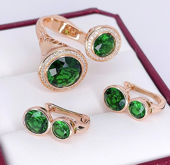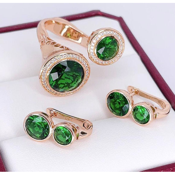 Позолоченный гипоаллергенный сплав (покрытие —золото 585 пробы), вставки — фианиты. Высота серег 2 см, английский замок. Размеры кольца: 20. Остался 1 набор.