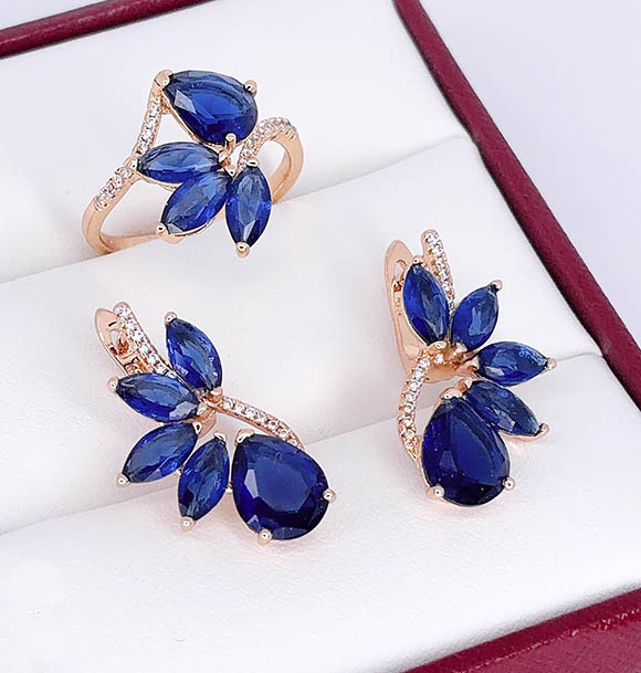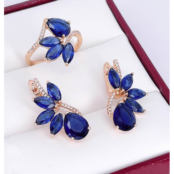 Позолоченный гипоаллергенный сплав (покрытие —золото 585 пробы), вставки — фианиты. Высота серег 2,5 см, английский замок. Размеры кольца: 19. Остался 1 комплект.