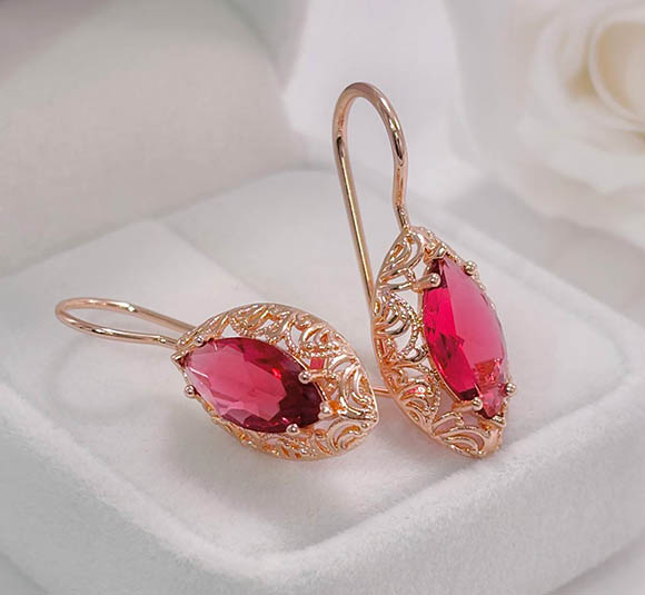 Гипоаллергенный сплав, покрытие выполнено из золота 585 пробы, вставки — фианиты. Высота серег 3,3 см, французский замок.