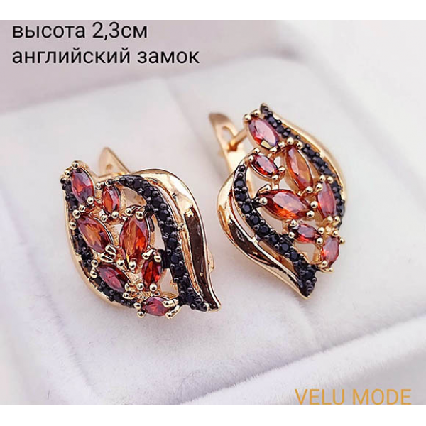 Гипоаллергенная бижутерия. Ювелирный сплав, покрытие — золото 585 пробы, фианитовые вставки. Высота серег 2,3 см, английский замок.