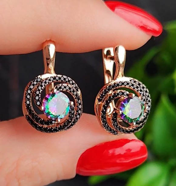 Не вызывающая аллергии бижутерия. Ювелирный сплав, покрытие — золото 585 пробы и черный родий, вставки — фианиты. Высота серег 2,2 см, английский замок.