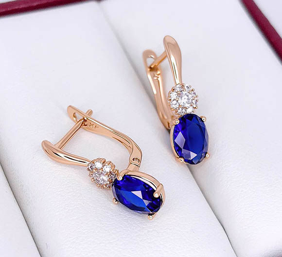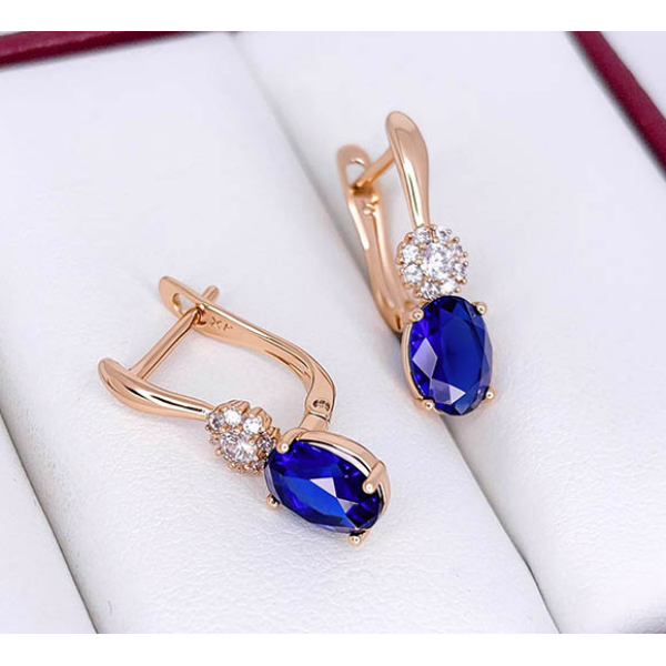 Гипоаллергенная бижутерия. Ювелирный сплав, покрытие выполнено из золота 585 пробы, вставки — фианиты. Высота серег 2,1 см, английский замок.