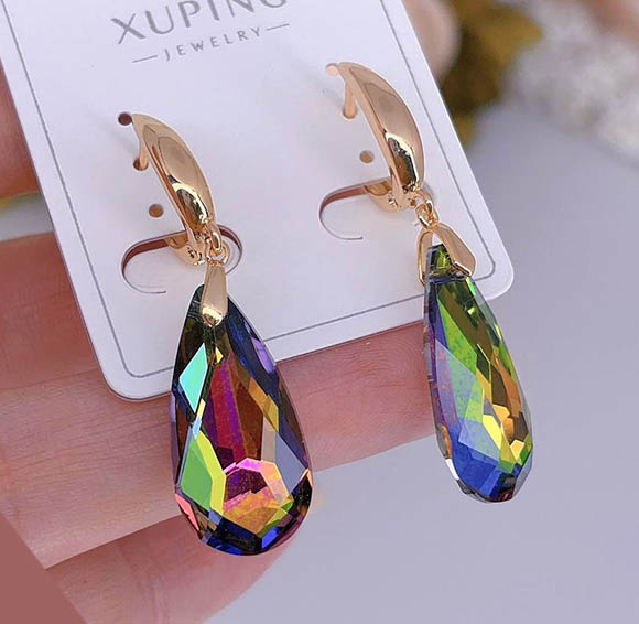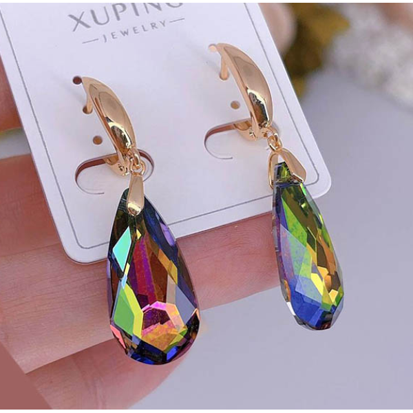Гипоаллергенный сплав, покрытие выполнено из золота 585 пробы, вставки — кристаллы Сваровски. Длина серег 4,5 см, английский замок.