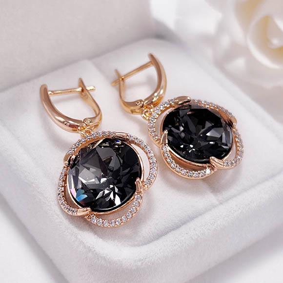 Не вызывающая аллергии бижутерия. Ювелирный сплав, покрытие — золото 585 пробы, вставки — кристаллы Сваровски. Длина серег 3,6 см, английский замок.