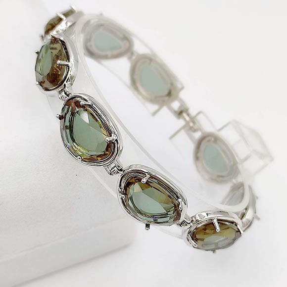 Гипоаллергенная бижутерия. Ювелирный сплав, покрытие выполнено из серебра 925 пробы, вставки — султаниты, которые при перемене освещения могут менять цвет от зеленого до малинового. Размер браслета 19 см, ширина 13 мм.