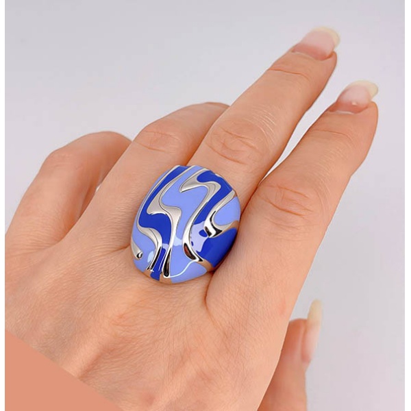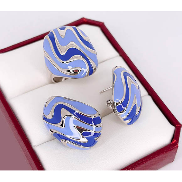 Ювелирный сплав, гипоаллергенное покрытие из серебра, вставки — цветная эмаль. Высота серег 2,8 см, итальянский замок. Размеры кольца: 18. Остался 1 комплект.