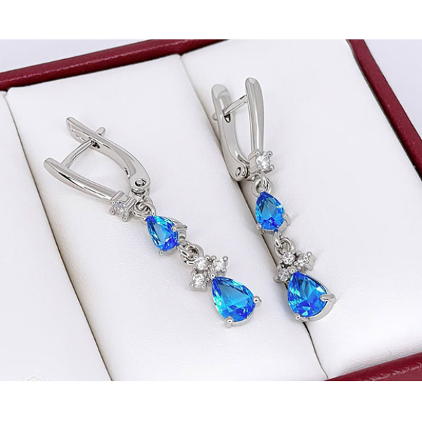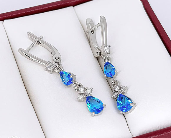 Не вызывающая аллергии бижутерия. Ювелирный сплав, покрытый серебром, вставки — фианиты. Длина серег 3,8 см, английский замок.