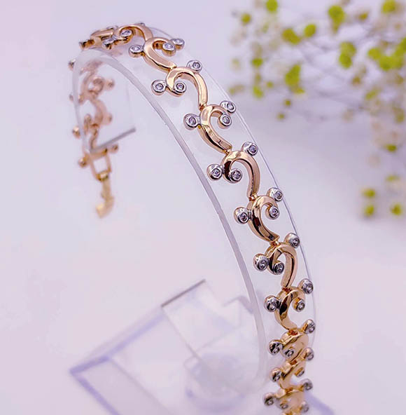 Не вызывающая аллергии бижутерия. Ювелирный сплав, покрытие — золото 585 пробы и родий, вставки — фианиты. Размер 17 см плюс добор 2 см.