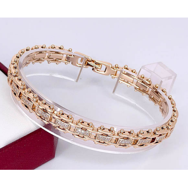 Позолоченный гипоаллергенный сплав (покрытие — из золота 585 пробы), вставки — фианиты. Размер 19 см, ширина браслета 9 мм.