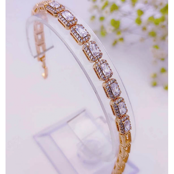 Позолоченный гипоаллергенный сплав (покрытие —золото 585 пробы), вставки — фианиты. Размер браслета 16,5 см плюс добор 2,5 см, ширина 6 мм.