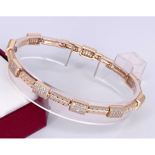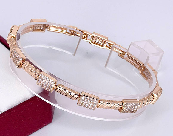 Не вызывающая аллергии бижутерия. Ювелирный сплав, покрытый золотом 585 пробы, вставки — фианиты. Размер браслета 16,5 см — 18,5 см, ширина 6 мм.