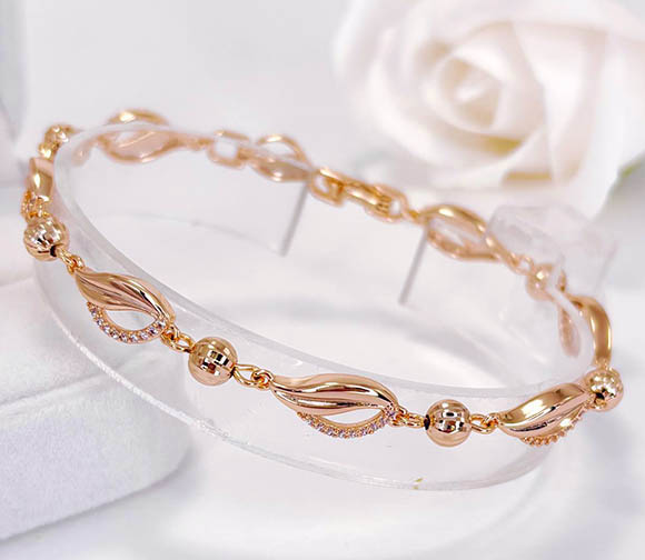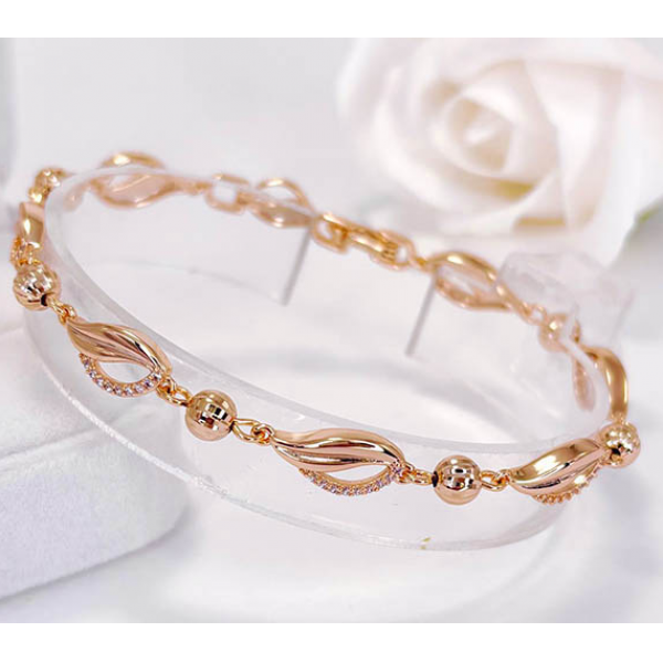 Не вызывающая аллергии бижутерия. Ювелирный сплав, покрытие — золото 585 пробы, вставки выполнены из фианитов. Длина 19 см, ширина 7 мм.
