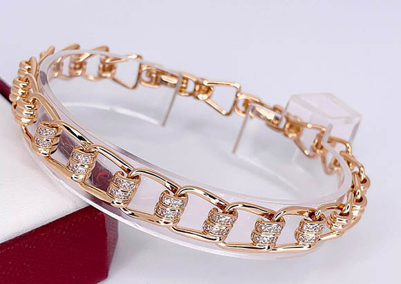 Гипоаллергенный сплав, покрытие выполнено из золота 585 пробы, фианитовые вставки. Размер 17 см — 19 см, ширина 9 мм.