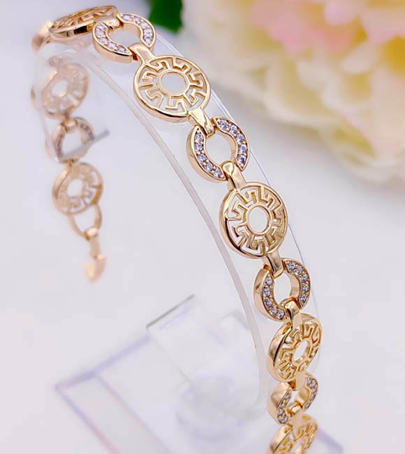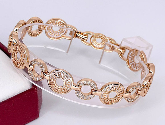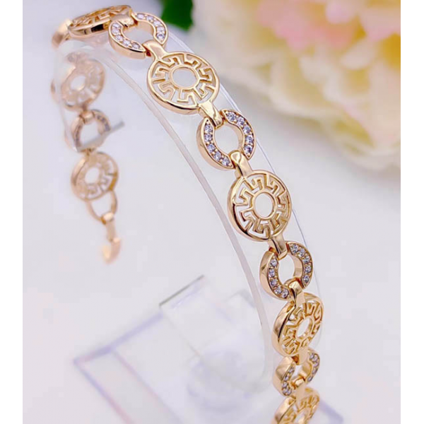 Не вызывающая аллергии бижутерия. Ювелирный сплав, покрытый золотом 585 пробы, фианитовые вставки. Размер: 17 см — 19 см; ширина 12 мм.