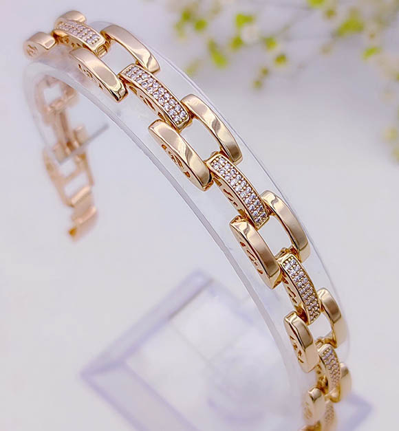 Гипоаллергенный сплав, покрытие выполнено из золота 585 пробы, вставки — фианиты. Размер 17,5 см+ добор 3 см, ширина 5 мм.