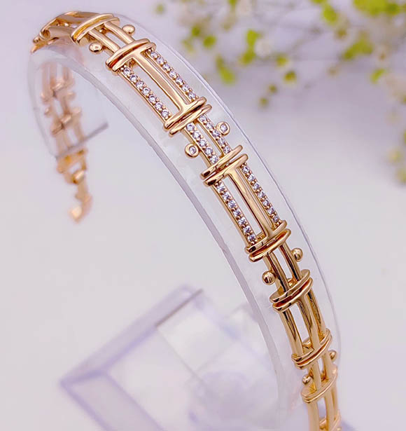 Ювелирный сплав, гипоаллергенное золотое покрытие (из золота 585 пробы), фианитовые вставки. Размер 16,5 см+ добор 2 см, ширина браслета 8 мм.