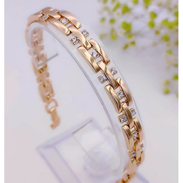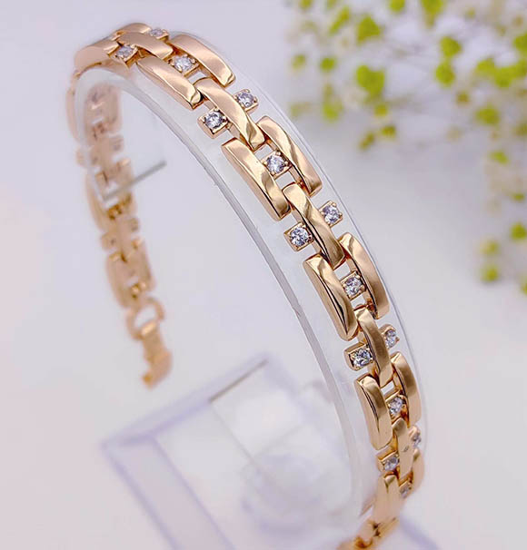 Не вызывающая аллергии бижутерия. Ювелирный сплав, покрытие — золото 585 пробы, фианитовые вставки. Размер 17 см плюс добор 2 см.