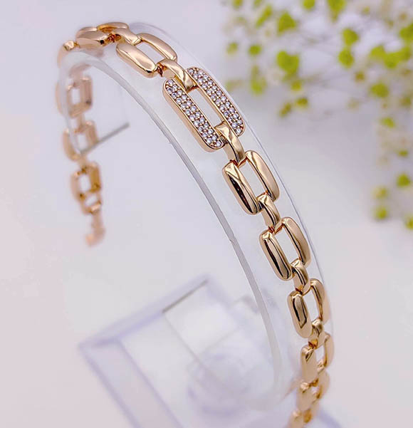 Гипоаллергенная бижутерия. Ювелирный сплав, покрытие — золото 585 пробы, вставки выполнены из фианитов. Размер браслета 17 см плюс добор 2 см.
