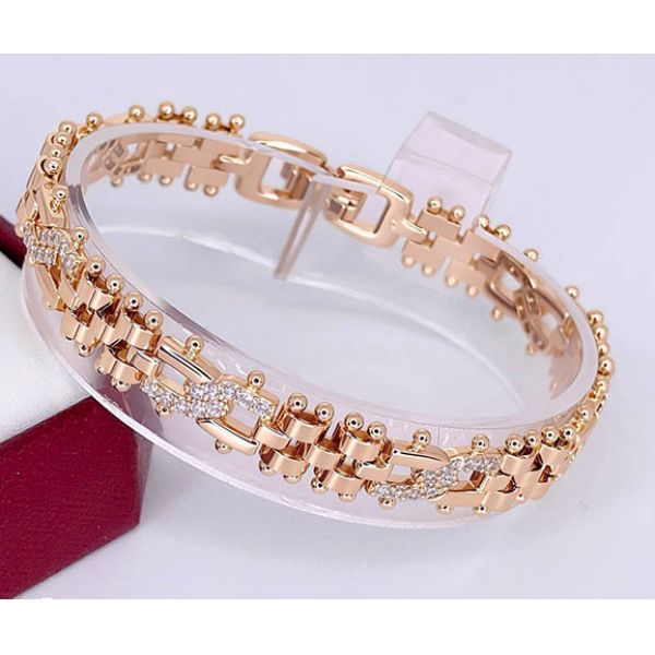 Гипоаллергенная бижутерия. Ювелирный сплав, покрытие — золото 585 пробы, фианитовые вставки. Размер 17 см, ширина браслета 9 мм.