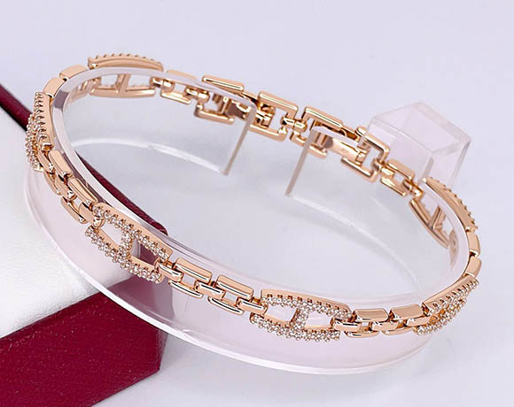 Гипоаллергенная бижутерия. Покрытый золотом 585 пробы ювелирный сплав, вставки — фианиты. Длина браслета 16,5 см — 18 см, ширина 7 мм.